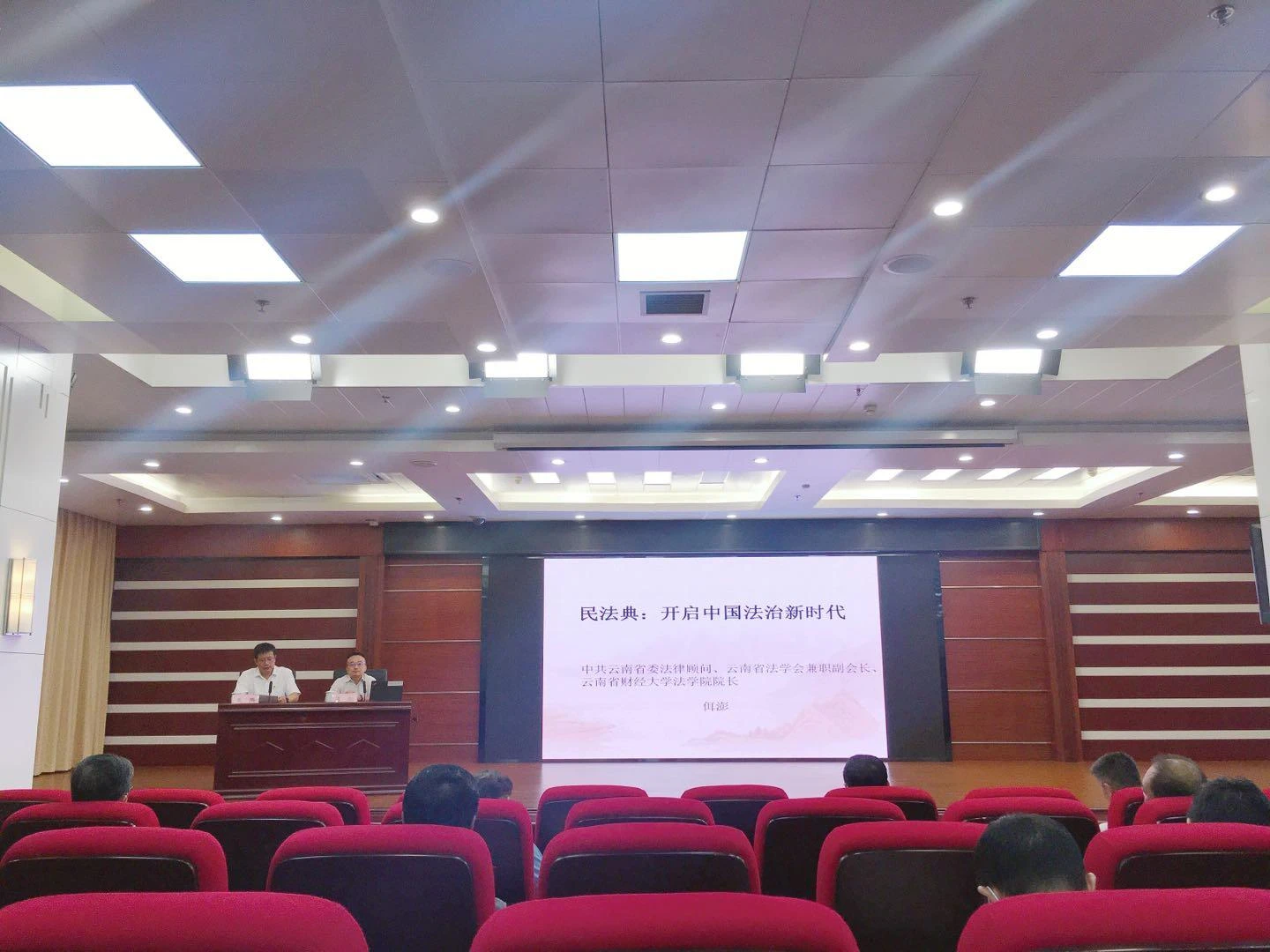 2020年7月9日上午,省法学会兼职副会长、云南财经大学法学院院长佴澎教授受邀为省发展改革委作《民法典:开启中国法治新时代》专题讲座。佴澎教授从“重要意义”“特色条文”“民法典对‘时代之问、民族之问、社会热点之问’的回应”三个方面,对《民法典》进行了深入生动的讲解,为参加培训的党员干部深刻理解、准确把握民法典核心要义作了很好的辅导。