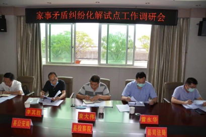 根据工作任务分工,2020年2月份,德宏州委政法委、州法学会积极组织试点工作相关文件的起草制定,在广泛征求州、县市相关部门意见的基础上,制定了《关于开展家事纠纷化解共建、共治、共享基层社会治理机制试点工作的实施方案》《德宏家事纠纷化解共建、共治、共享基层社会治理机制试点工作联席会议制度》,明确了试点工作的总体要求、基本原则、领导机构、实现目标、方法步骤、成员单位职责等工作内容;3月份,州委政法委对试点工作进行了安排部署;4月22日至23日,德宏州委政法委、州法学会组织调研组对试点工作进行了调研督查,实地查看并听取了瑞丽市、盈江县开展家事矛盾纠纷化解试点工作推进情况汇报,调研组对试点工作推进情况给予了肯定,并提出了相关指导意见。目前,瑞丽市、盈江县试点工作正在有序推进。