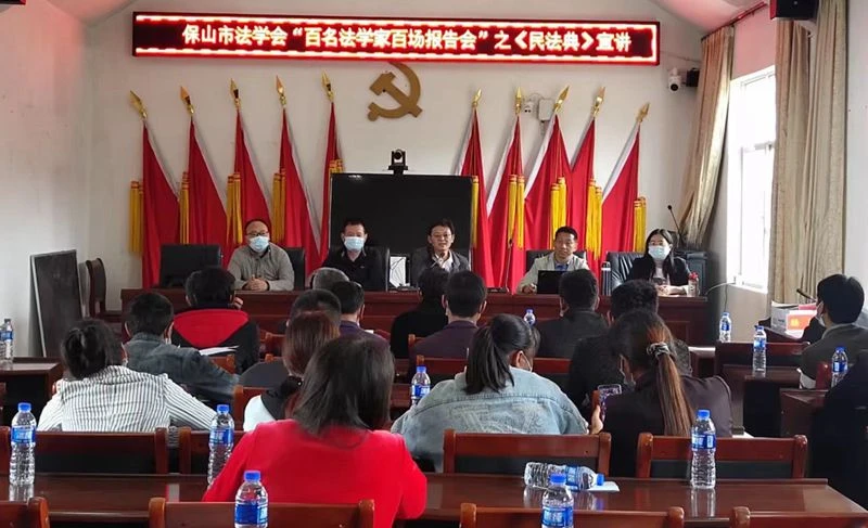 5月16日,保山市委政法委、市法学会到龙陵县龙山镇尹兆场社区挂牌成立“法律专家服务站”,并组织“百名法学家百场报告会”之《民法典》宣讲活动。保山市委政法委副书记张瑞芳,驻站法律专家,市、县法学会和社区代表50余人参加。