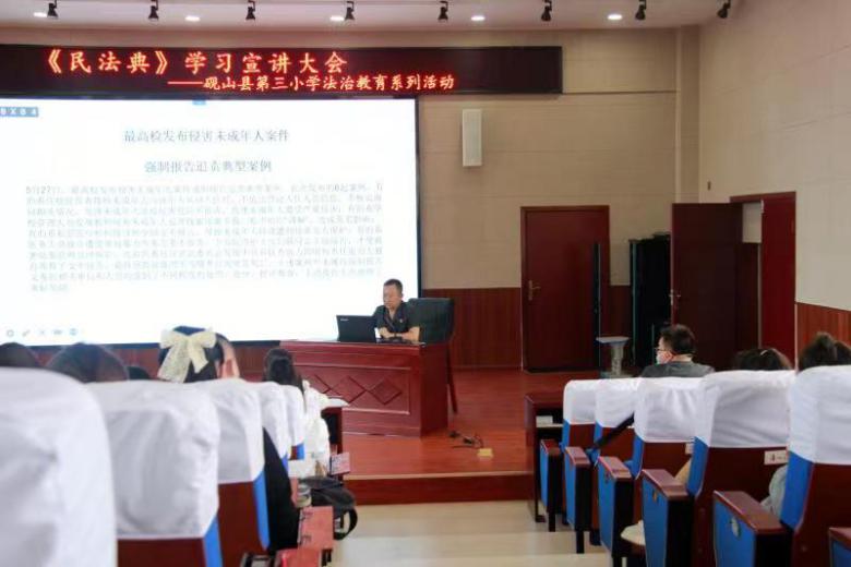 近日,文山州砚山县法学会会员、县人民法院法官到砚山县第三小学开展民法典学习宣讲大会,学校全体师生100余人参加本次讲座。