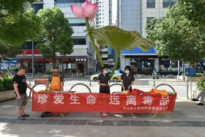 6月26日,文山市法院组织法学会会员到城区东风路步行街开展“全民禁毒”集中宣传活动。