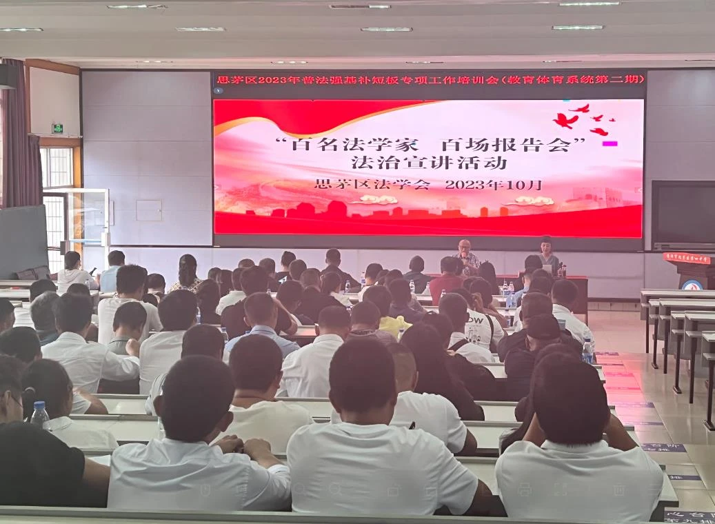 为深入学习宣传贯彻党的二十大精神,贯彻落实习近平法治思想,弘扬法治精神、建设法治文化,营造良好的法治宣传氛围,近日,普洱市思茅区法学会联合相关部门在思茅四中举办全区教育体育系统2023年“百名法学家百场报告会”法治宣讲活动,邀请云南师范大学法学教授房珂竹进行专题授课,区政法各单位、区属各部门领导干部和各级学校教师共100余人参加活动。