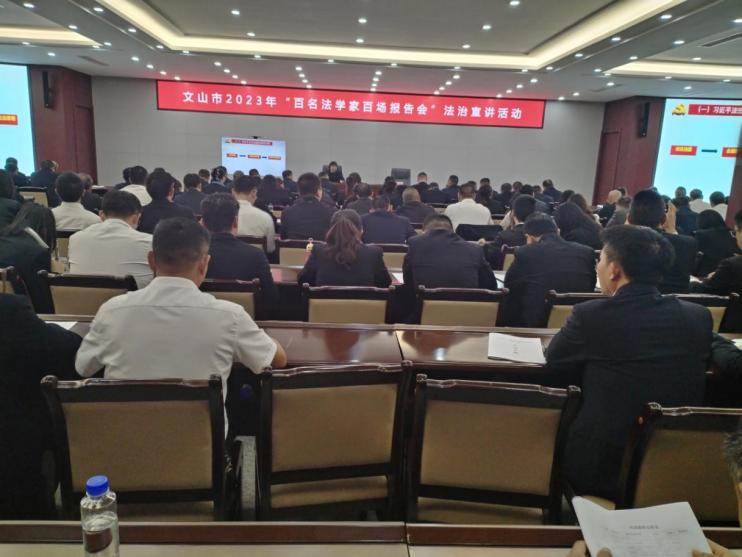 为深入学习贯彻习近平法治思想,近日,文山市法学会举办“百名法学家·百场报告会”法治宣讲活动。活动邀请文山州法学会常务理事、文山学院马克思主义学院博士、副教授华袁媛授课。文山市委政法委及市法学会全体干部职工,17个乡镇(街道)政法委员、综治专干,全市社区党组织书记及各乡镇(街道)致富带头人等190余人到会场聆听。