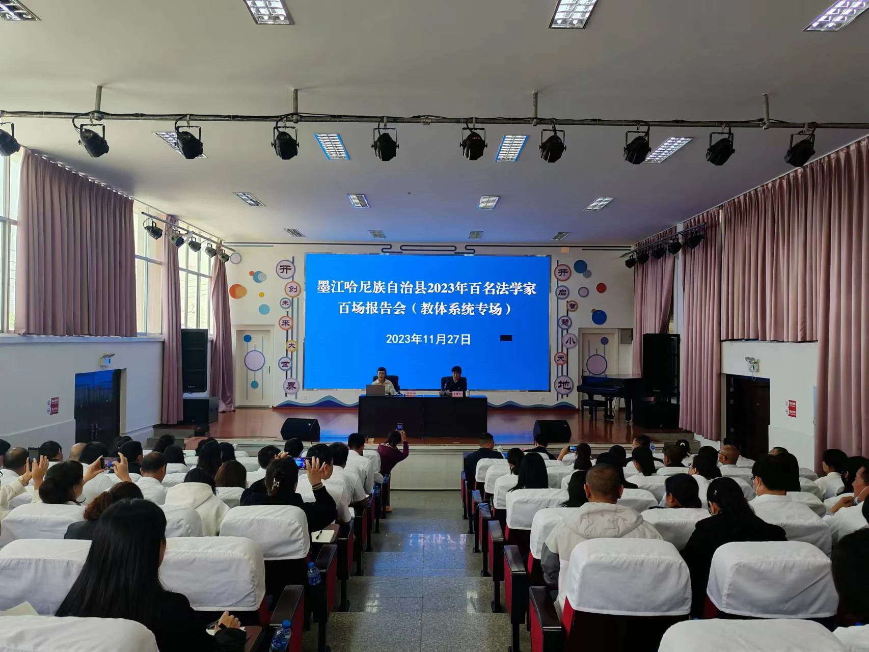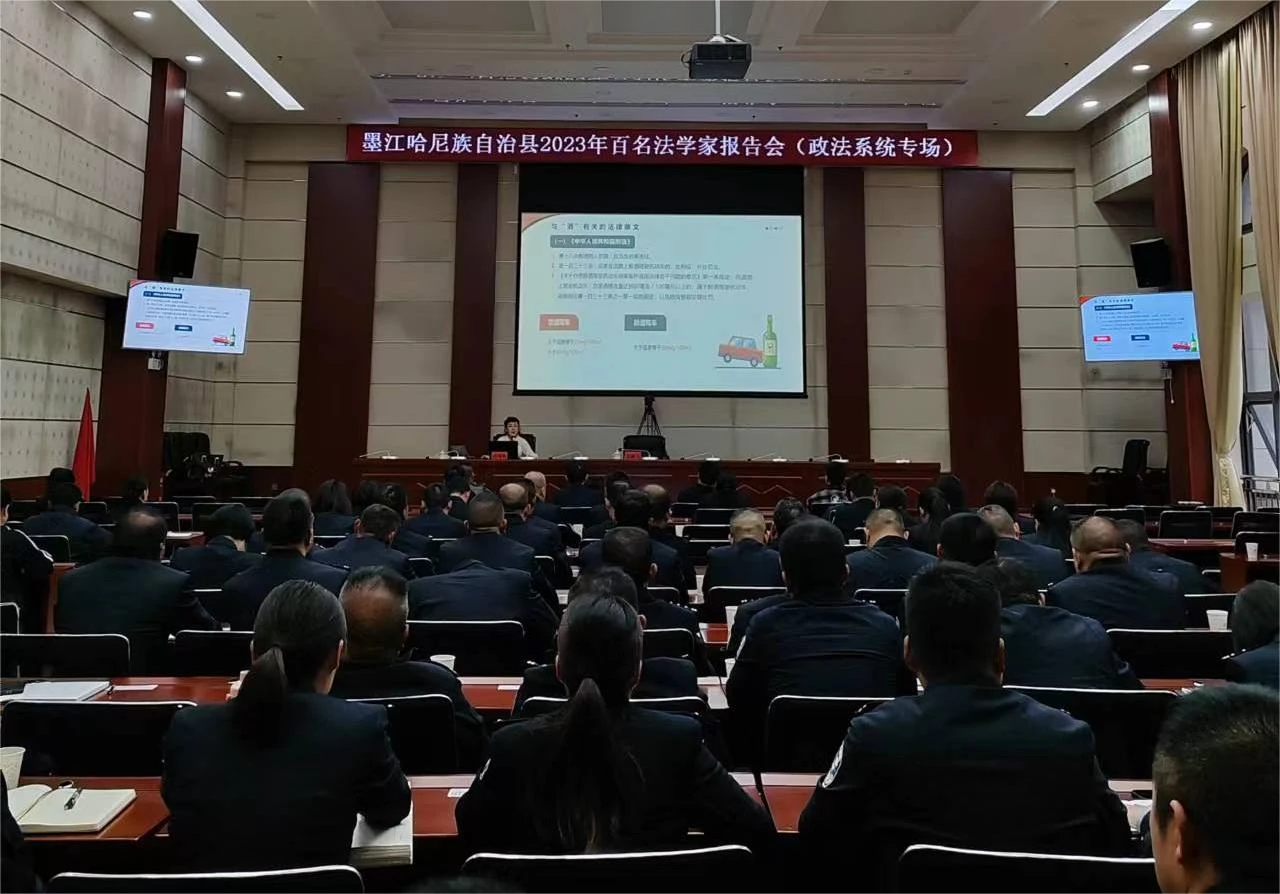 为全面深入贯彻落实省、市关于普法强基补短板专项行动部署要求,增强政法干警的法治思维和依法办事能力,提升广大教师法治意识,近日,普洱市墨江县法学会举行“百名法学家百场报告会”政法干警专场、教体系统专场活动。