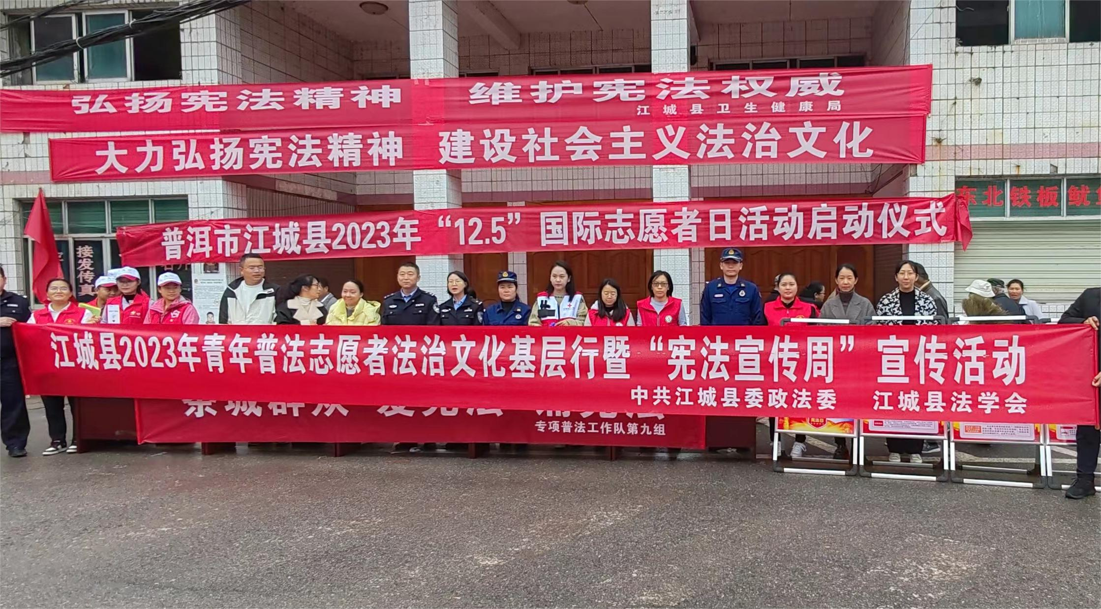 近日,普洱市江城县法学会联合省专项普法第九工作组,江城县委政法委、县法院、县检察院、县公安局、县司法局等单位,在江城县老影剧院门口开展2023年青年普法志愿者法治文化基层行暨“宪法宣传周”联合集中普法活动,大力弘扬宪法精神,推动社会主义法治文化建设。