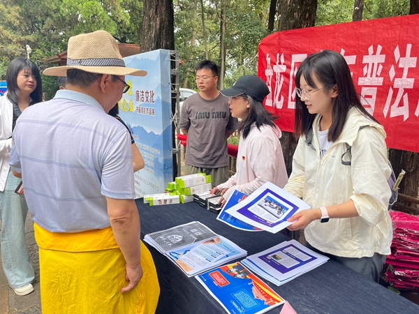 为以党建引领推动法学会高质量发展,7月24日,昆明市盘龙区法学会组织会员及普法志愿者积极参加区委政法委机关党支部、区检察院第一党支部、昆明市金殿名胜区第一党支部在金殿名胜区联合开展的链式主题党日活动,深入群众身边开展与群众切身利益相关的法治宣传活动。