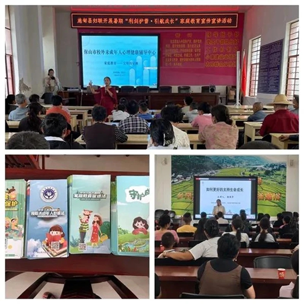 宣讲活动相继在太平镇、水长乡、由旺镇、甸阳镇、万兴乡开展。活动邀请保山市家庭教育讲师团成员对留守儿童及监护人进行未成年人保护法、预防未成年人犯罪法、家庭教育促进法、妇女权益保障法等法律法规宣传,开展以《父母的觉醒》《如何更好的支持孩子的成长》和《传承好家风建设好家庭》等为主题的家庭教育指导。