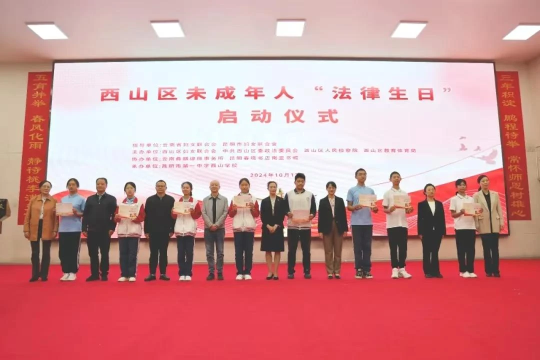 近日,昆明市西山区未成年人“法律生日”启动仪式在昆明市第一中学西山学校举行。此次活动是西山区委政法委、区法学会、区妇联、区人民检察院、区教育体育局等多部门落实立德树人根本任务,增强协同育人共识,进一步加强和改进未成年人权益保护,强化未成年人犯罪预防和治理的重要举措。