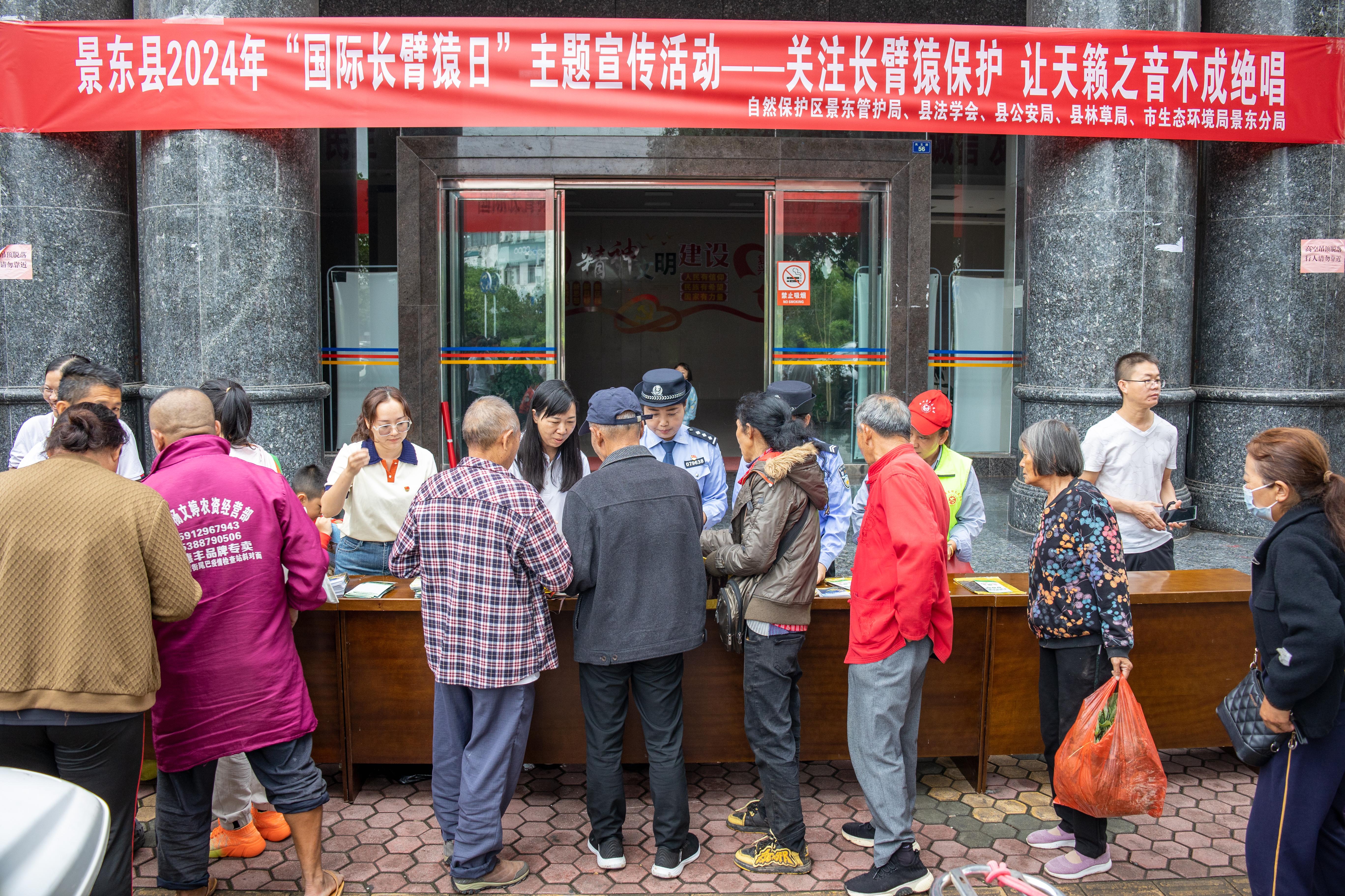 在国际长臂猿日到来之际,普洱市景东县法学会联合云南无量山哀牢山国家级自然保护区景东管护局、景东县公安局、普洱市生态环境局景东分局、景东县林业和草原局等单位开展以“关注长臂猿保护 让天籁之音不成绝唱”为主题的宣传活动。