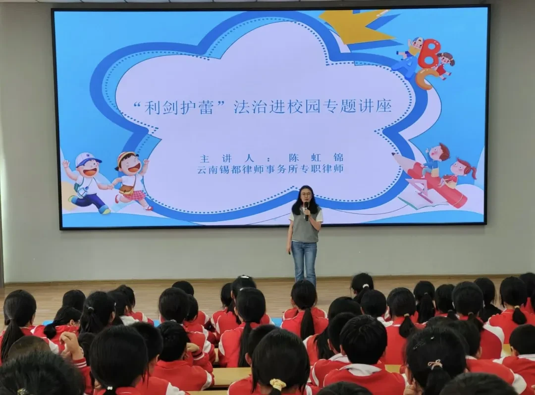 在红旗小学,云南锡都律师事务所陈虹锦律师以“利剑护蕾护航青春”为主题,从“法”字的由来和寓义、法律与日常学习生活的关系、青少年的不良行为等方面,结合刑法、预防未成年人犯罪法、未成年人保护法的相关内容,通过以案释法、问答互动的形式,让学生了解犯罪的严重后果,教导学生运用法律维护自身合法权益,做一个遵纪守法的小公民。