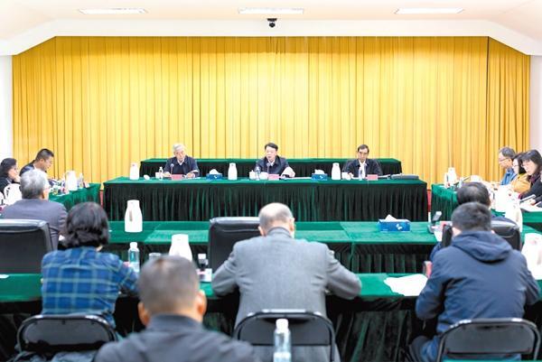 10月28日,中国法学会党组召开会议,传达学习贯彻党的二十届四中全会精神。中国法学会党组书记、常务副会长王洪祥主持会议并讲话,党组成员、副会长兼秘书长景汉朝,党组成员、副会长杨万明、王振江出席会议。任兆生/摄