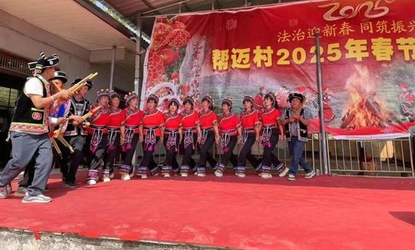 在帮迈村打歌场的舞台上,村民们借助芦笙和三弦伴奏,跳起欢快的三跺脚。《法律常识记心间》等节目,将宪法、民法典等法律法规融入彝族打跳、山歌调子、广场舞中,让法治文化在传统打跳文化中焕发光彩,让复杂的法条变得生动易懂。