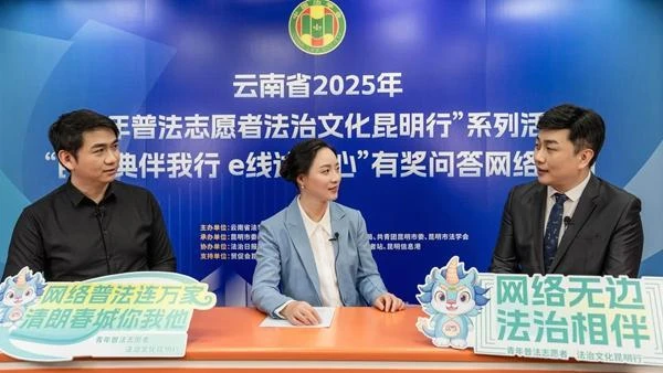 11月19日,云南省2025年“青年普法志愿者法治文化昆明行”系列活动——“民法典伴我行 e线达民心”网络直播普法活动在昆明市正能量网络实训基地举行。