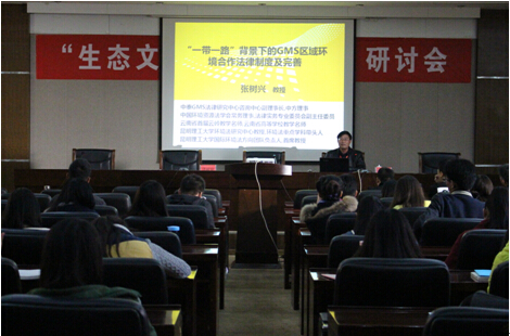 当天下午还举行了“生态文明与环境法治”研讨会。研讨会由西南林业大学人文学院副院长饶峻妮主持。会上,昆明理工大学杨士龙教授作“生态文明建设与环境法的发展”、云南大学蔡磊副教授作“‘邻避’问题克服的制度途径”、中泰GMS法律研究中心副理事长张树兴教授作“‘一带一路’背景下的GMS次区域环境合作法律机制及完善”、西南林业大学陈悦副教授作“生态文明视域下云南省湿地保护”等主题发言。专家们呼吁,在努力成为生态文明建设排头兵过程中,必须加强云南生态法学建设,在全社会进一步强化生态文明的意识,为云南的绿水青山守望护法。