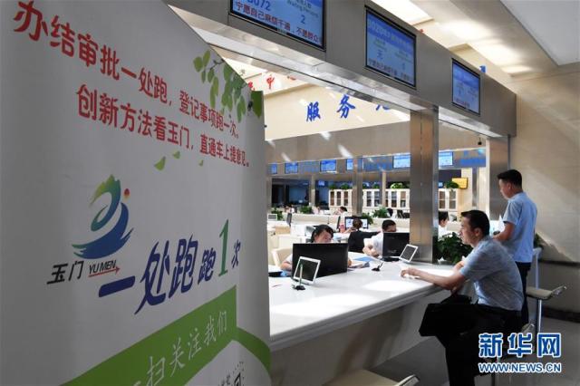 市民在甘肃省玉门市民中心服务大厅窗口办理业务(2018年8月17日摄)。2017年以来,甘肃省玉门市不断深化“放管服”改革,推行“一窗办一网办简化办马上办”,将当地各部门所有行政审批和公共服务事项向市民中心服务大厅集中,在网络上向电子政务平台集中。 新华社记者 范培珅 摄