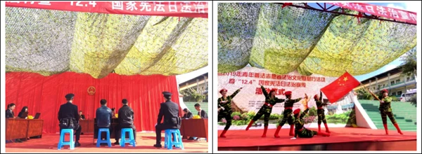 活动现场,来自省、州、县法学会和当地各有关单位、部门的普法志愿者,勐腊县各政法单位干警,学校师生开展了升国旗、唱国歌和集体向宪法宣誓仪式,并通过发放宣传资料、观看特警演练、模拟法庭庭审、法治文艺节目、法治文化书画展和法治讲座等群众喜闻乐见的方式宣传了宪 法、法律知识,取得了良好效果。