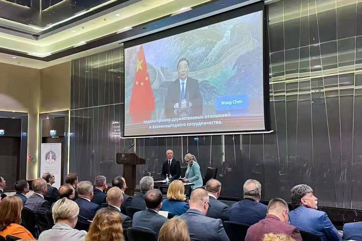 中共中央政治局委员、全国人大常委会副委员长、中国法学会会长王晨27日应邀在白俄罗斯法律家联盟第十届大会开幕式上发表视频致辞。