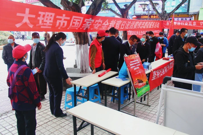 4月14日下午,在第七个“4·15全民国家安全教育日”来临之际,大理市法治宣传志愿服务队在绿玉公园开展了一场以“树牢总体国家安全观,感悟新时代国家安全成就,为迎接党的二十大胜利召开营造良好氛围”为主题的法治宣传志愿服务活动。