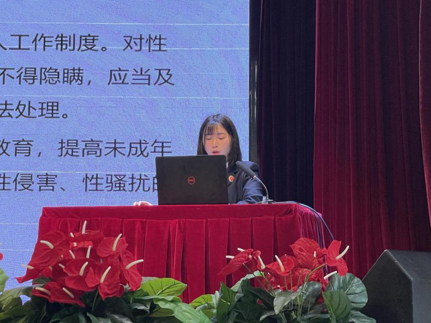 2022年4月8日上午,澄江市法学会联合检察院、教育体育局在澄江市青少年学生活动中心开展宣传活动。检察院检察官、法学会法律专家李媛为广大中小学、幼儿园德育教师开展了关于预防校园性侵、未成年人保护、国家安全的专题报告会,此次报告会共120名教师参加,参加报告会后各德育教师将为本校师生进一步开展法治教育培训。