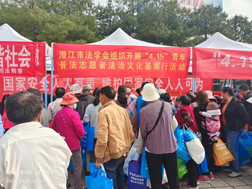 4月15日,澄江市委政法委联合法学会、司法局等多家单位青年普法志愿者在澄江市小广场开展“4·15全民国家安全教育日”集中普法宣传教育活动。