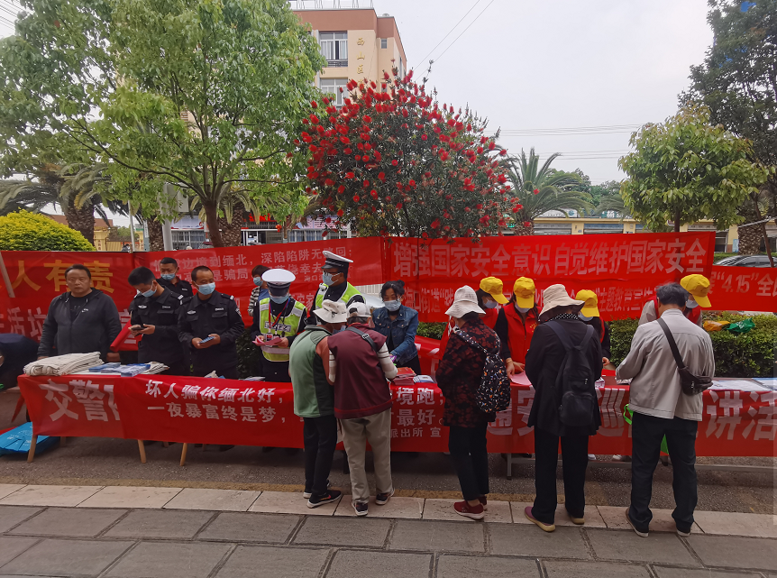 4月15日,西山区法学会、区普法办、区司法局、区保密局、团结司法所联合在团结街道乐居社区开展国家安全法治宣传活动。活动现场,工作人员通过现场宣讲法律法规、送法入户、悬挂布标、发放宣传产品等方式,向群众详细阐释《中华人民共和国国家安全法》《中华人民共和国反恐怖主义法》《中华人民共和国反有组织犯罪法》《中华人民共和国反间谍法》等法律知识,号召群众提高国家安全意识,增强维护国家安全的自觉性。活动共计发放各类法律法规、法治宣传作业记录本和宣传折页等普法宣传资料1000余份。
