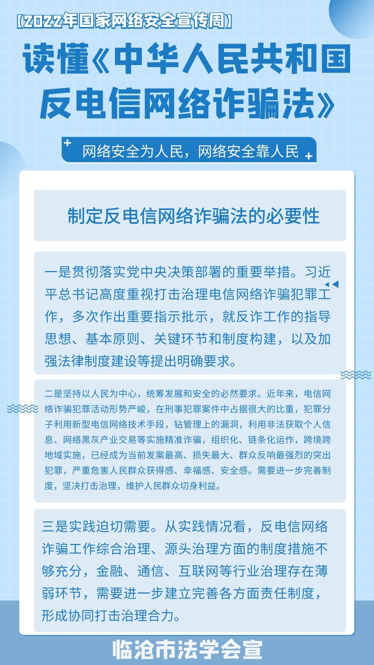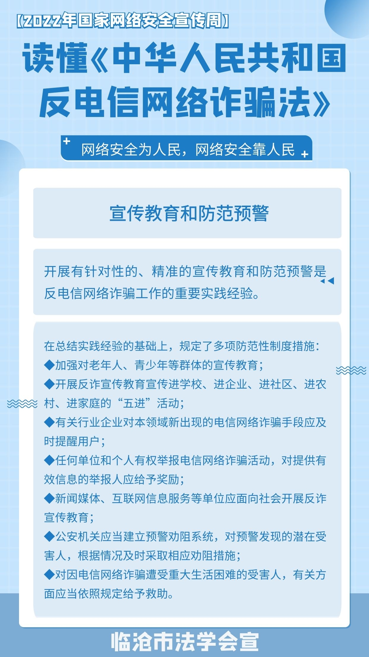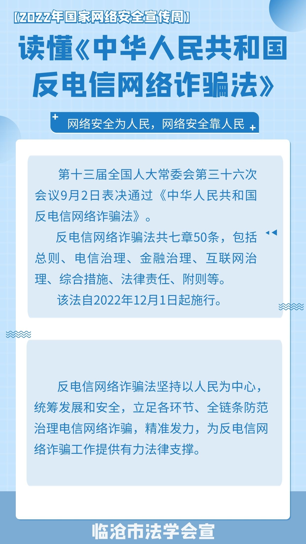 2022年国家网络安全宣传周活动时间是9月5日至9月11日,今年的国家网络安全宣传周继续以“网络安全为人民,网络安全靠人民”为主题,着力提升全民安全意识和防护技能。在2022年国家网络安全宣传周到来之际,我们一起来学习《中华人民共和国反电信网络诈骗法》吧!