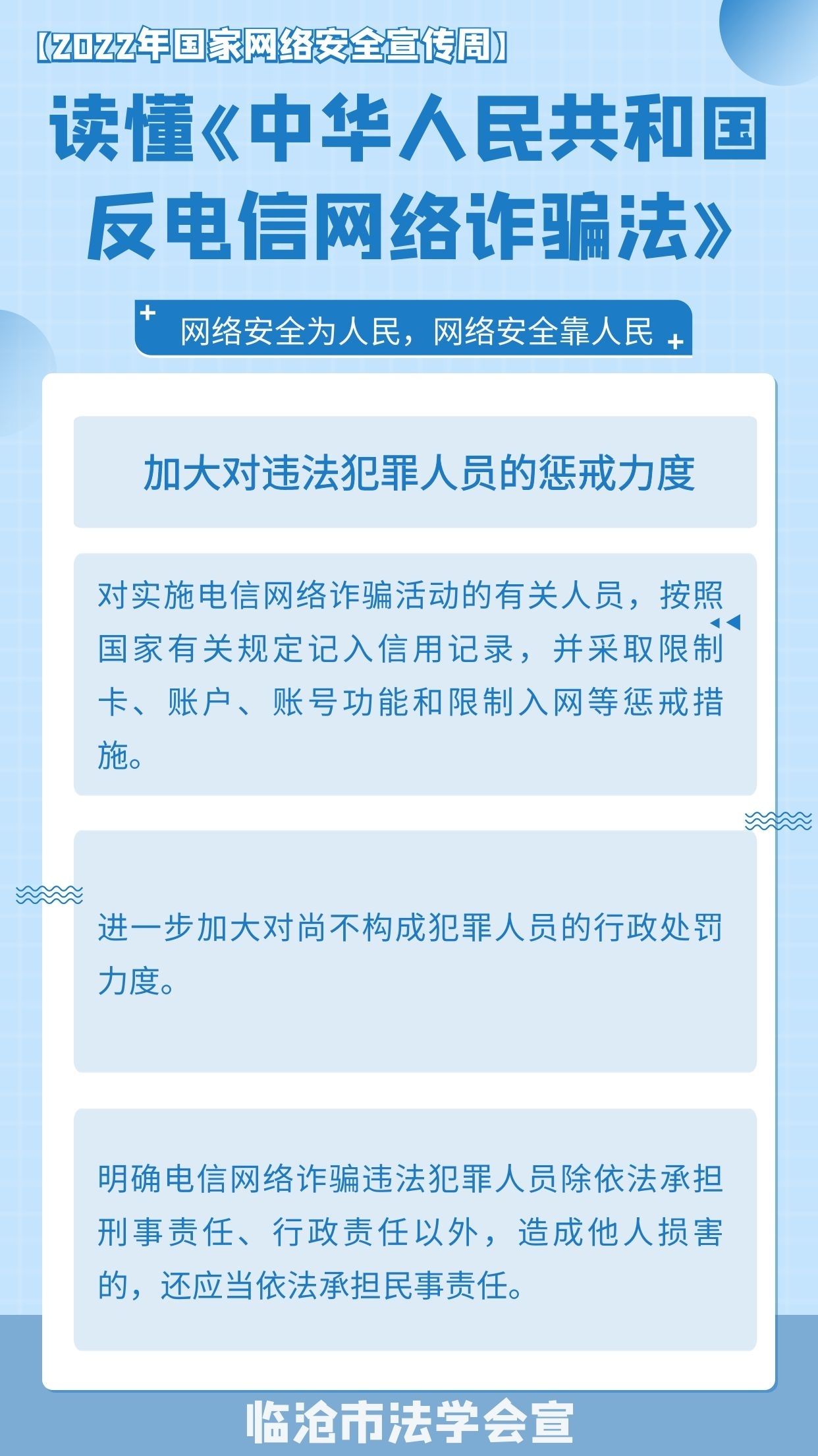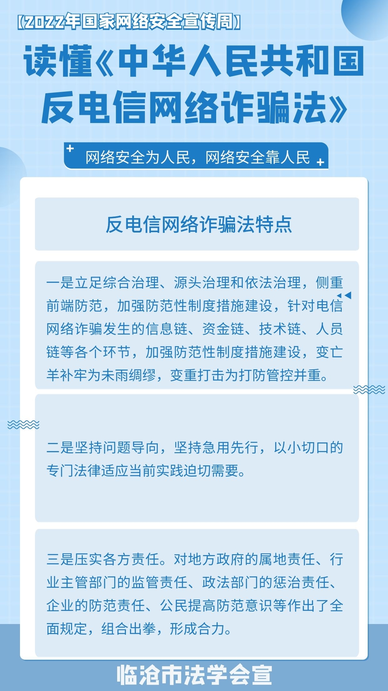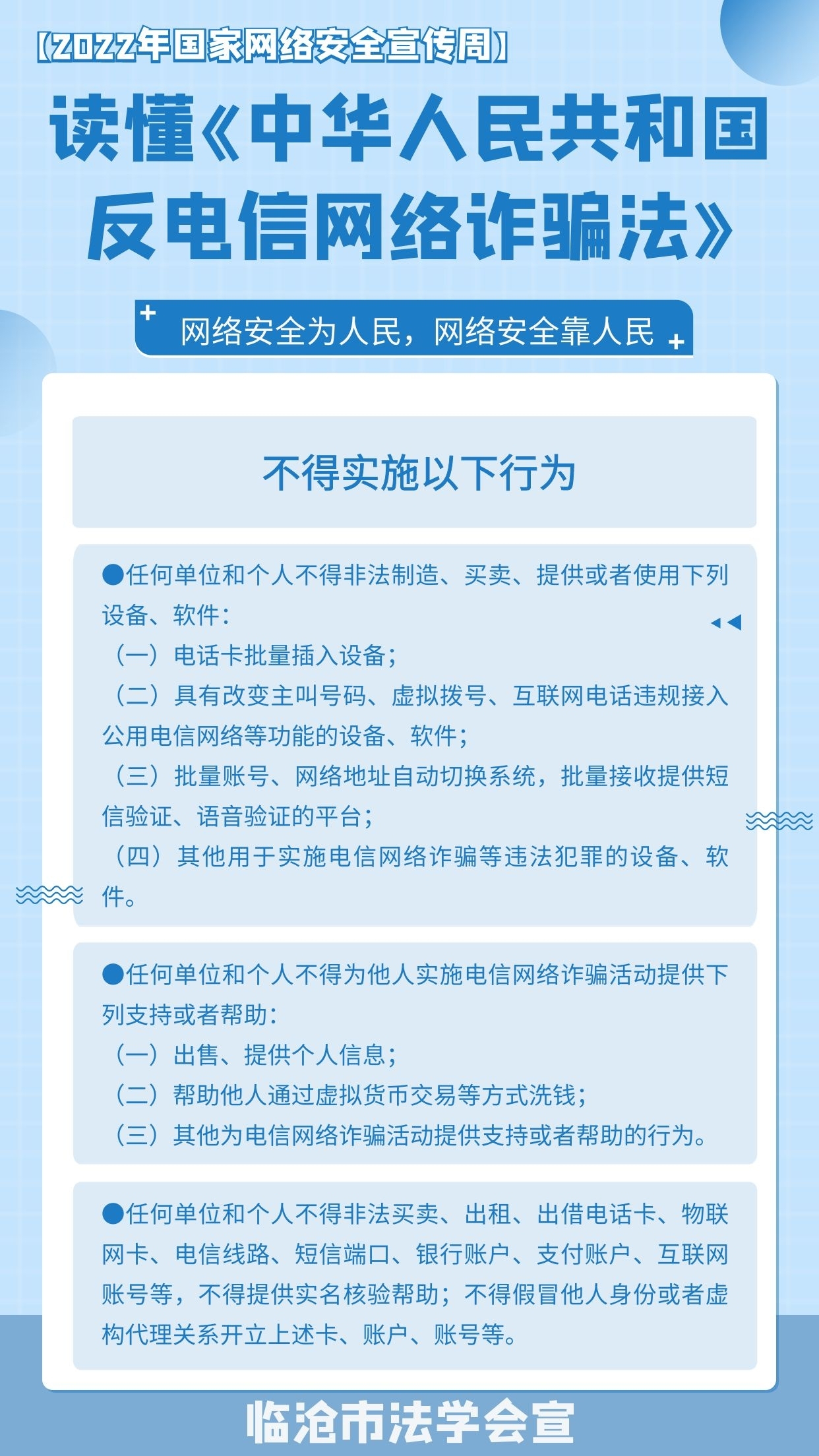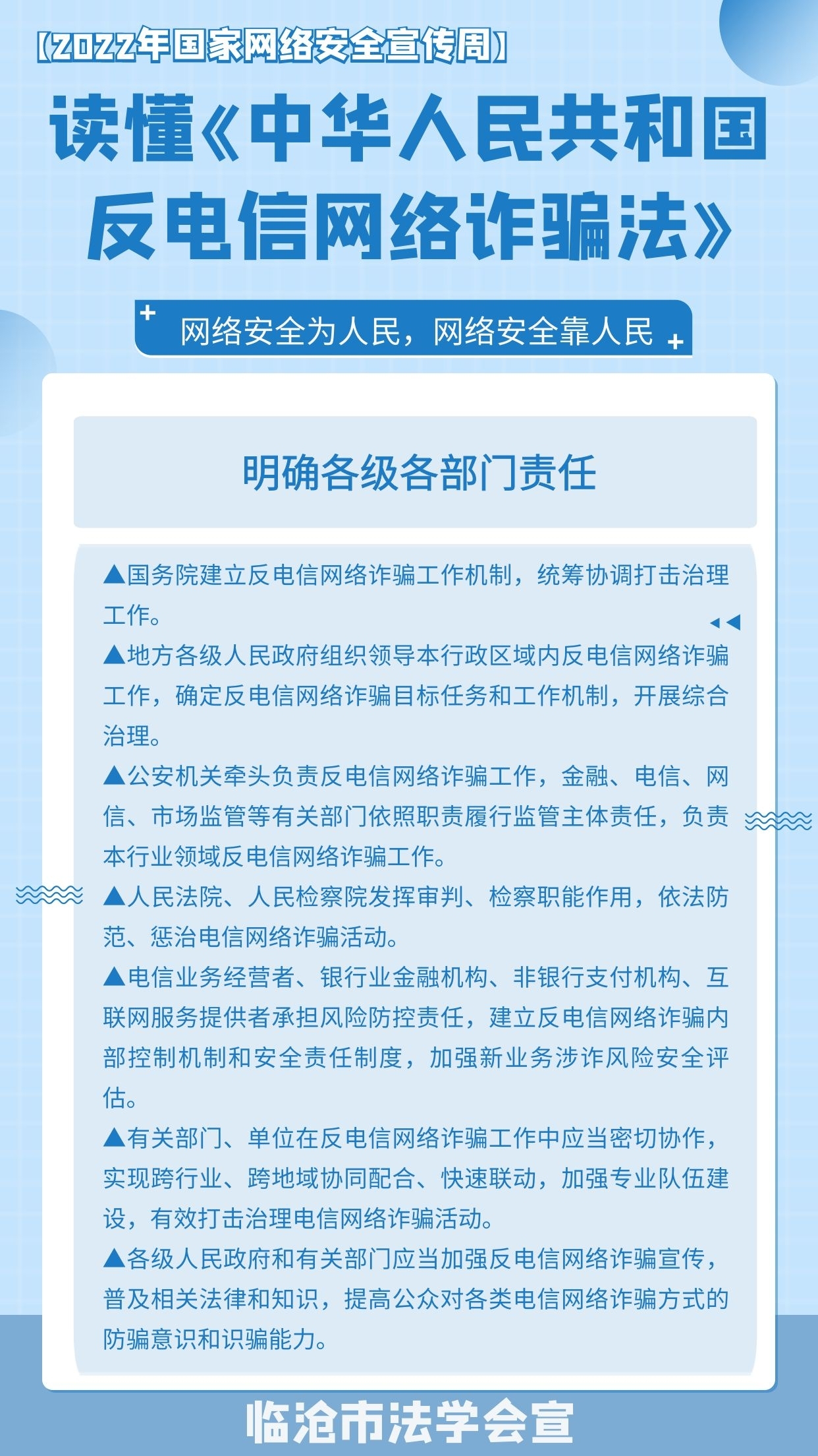 2022年国家网络安全宣传周活动时间是9月5日至9月11日,今年的国家网络安全宣传周继续以“网络安全为人民,网络安全靠人民”为主题,着力提升全民安全意识和防护技能。在2022年国家网络安全宣传周到来之际,我们一起来学习《中华人民共和国反电信网络诈骗法》吧!