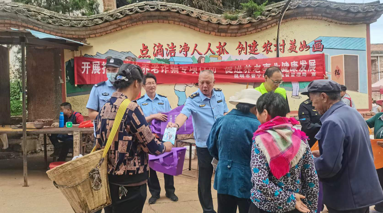 近日,昆明市晋宁区法学会联合上蒜派出所、司法所、市场监督管理所等,在人员聚集的乡镇农村集贸市场开展了一次关于预防养老诈骗和预防电信网络诈骗的法治宣传活动,以提醒老年人注意保护隐私、不透露个人及家人信息。本次活动共发放各类宣传册、宣传物品500余份,取得良好宣传效果。