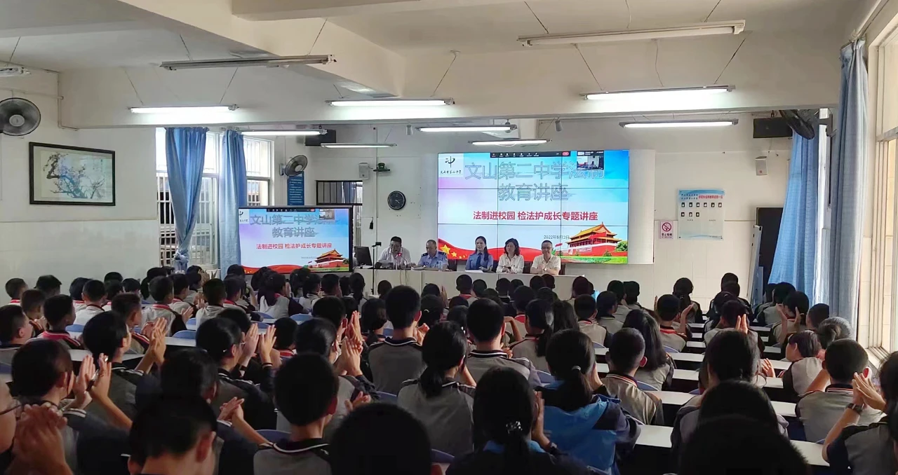 9月开学季,文山市法学会会员赵涌钦、罗云走进校园文山市第一中学、文山市第二中开展“法治进校园、检法护成长”专题讲座。
