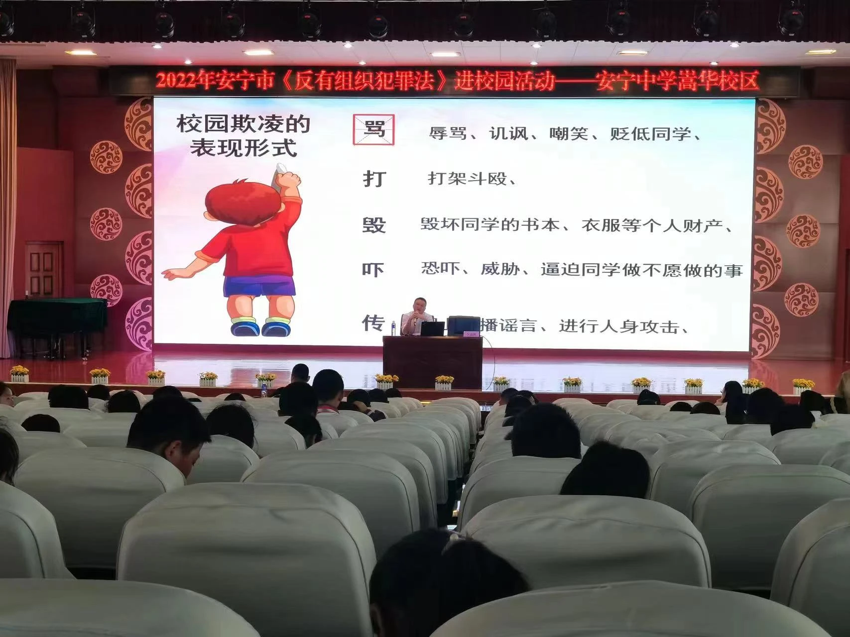 近日,由安宁市委政法委、市法学会等单位联合主办,市向日葵青少年事务服务中心承办的《反有组织犯罪法》进校园活动在安宁中学嵩华校区顺利开展,共400余名师生参与此次活动。