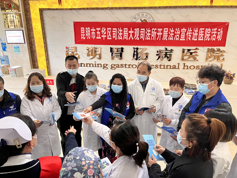 为进一步加强昆明市五华区辖区医院医务人员遵纪守法的观念,提升医院法治化管理水平,近期,昆明市五华区法学会联合五华区大观司法所到昆明胃肠病医院开展法治宣传进医院活动,在骤冷的天气中为全体医务工作者送来了法治温暖。