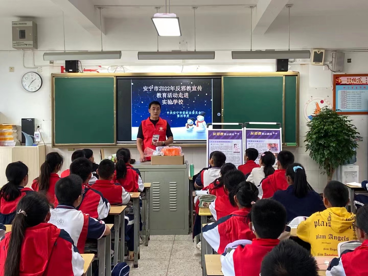 为进一步加强校园学生防邪、反邪思想意识,保护学生不受邪教侵害,积极构建和谐校园,努力营造积极向上、健康和谐的校园环境,近期,昆明市安宁法学会到安宁市实验学校开展反邪教宣传教育活动,有效加强学生识邪教、反邪教意识,提高抵御邪教侵蚀的能力,营造校园浓厚的反邪、防邪氛围。