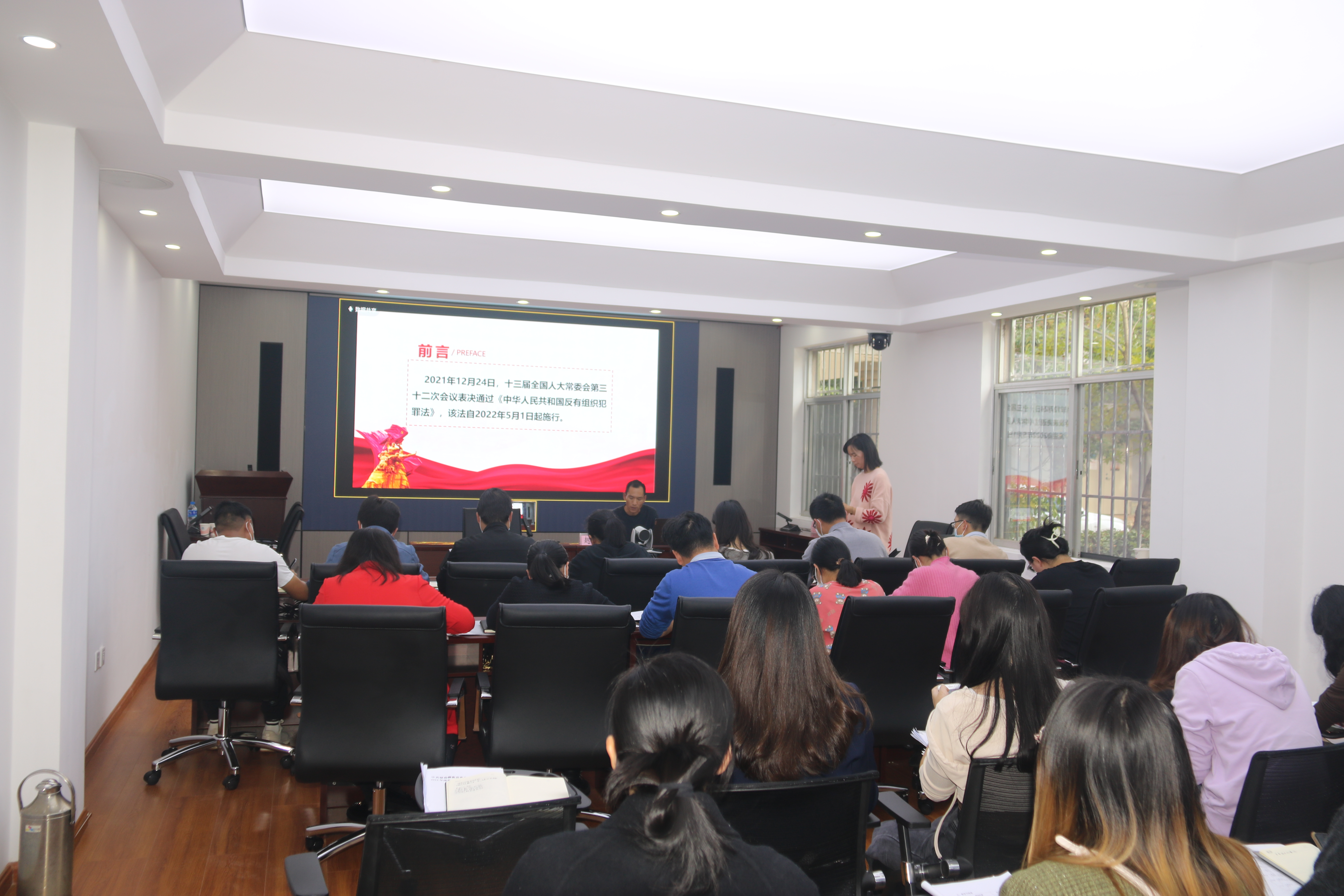 学习培训中,授课人首先解读了“什么是有组织犯罪”“什么是黑社会性质组织”“什么是恶势力组织”和“什么是软暴力”等法律术语,并从立法背景、重点条文解析、立法亮点解读三个方面对《反有组织犯罪法》进行了解读,并认为今年5月1日起施行《反有组织犯罪法》是彰显中国特色,是非常具有中国特色的法律,核心概念明确,适用标准统一,在特别领域当中具有特别的适用效力,强调综合治理,达到“惩、防”结合,是保障有效司法的重要法律之一。《反有组织犯罪法》进一步贯彻落实党中央常态化开展扫黑除恶斗争的重大决策部署,进一步加强重点领域立法,推动完善社会主义法律体系,推进国家治理体系和治理能力现代化,体现了践行以人民为中心的发展思想、以法治保障人民对美好生活的向往。