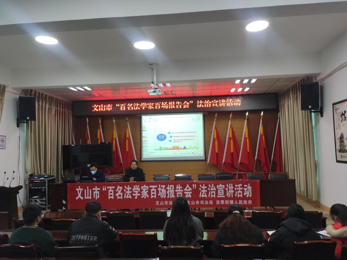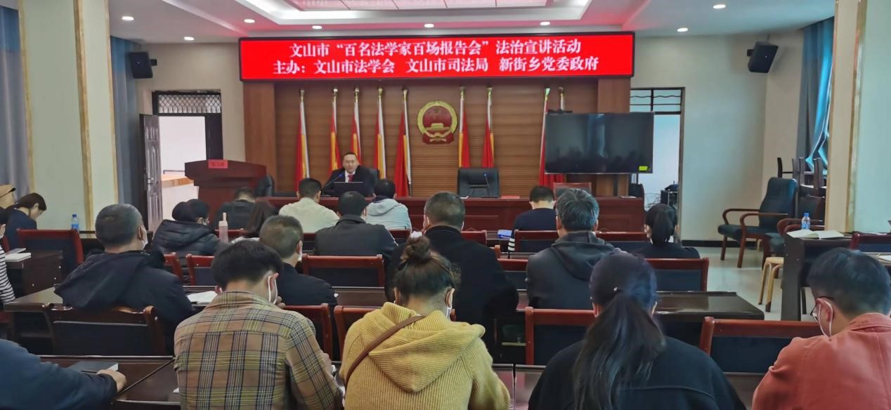 12月5日至12月6日,文山市法学会组织开展“百名法学家百场报告会”宣讲活动走进新平街道、追栗街镇、新街乡。活动邀请文山七乡侓师事务所、文山博引律师事务所、文山市律峰律师事务所律师,为乡镇(街道)干部职工授课。