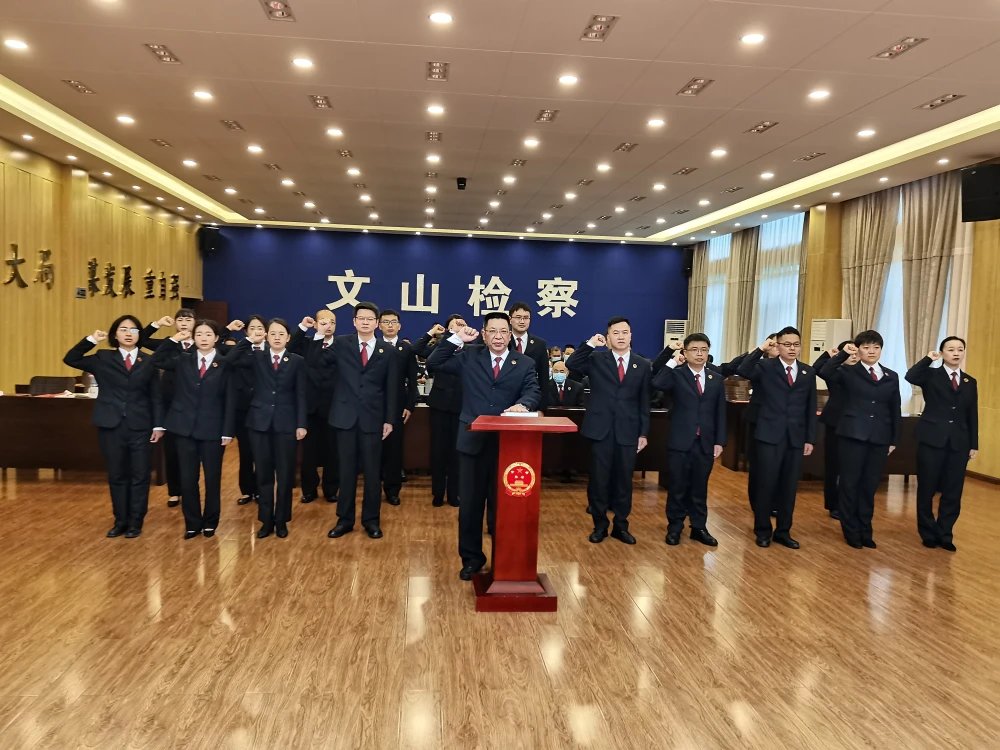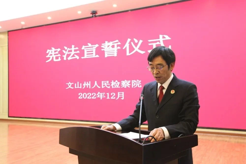 12月5日上午,文山州检察院举行宪法宣誓仪式。州检察院机关2021年以来新任职、新调入和新入职的20名检察人员、法学会会员开展宣誓,院党组成员、政治部主任、机关党委书记纳崇山领誓,院党组成员、副检察长宋贵华监誓,机关全体人员参加宣誓仪式。