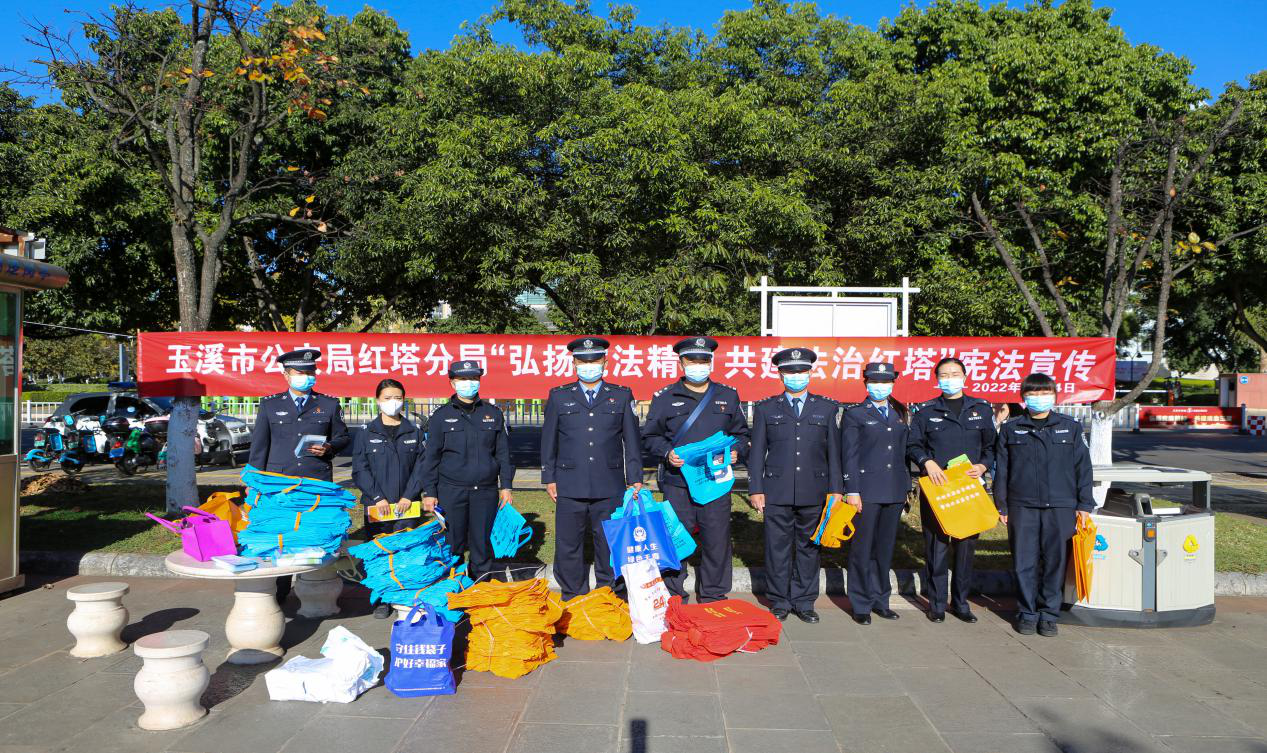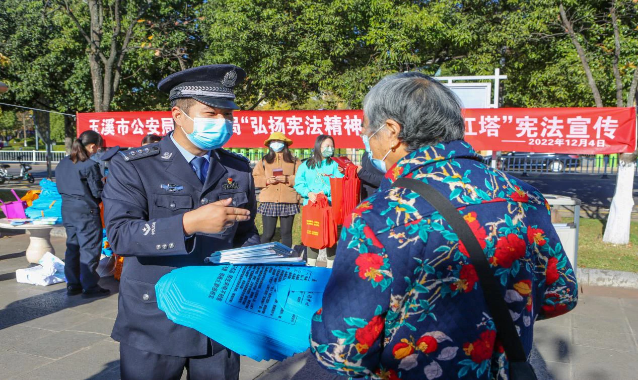 今年是我国现行宪法公布施行四十周年,也是《中华人民共和国国歌法》颁布实施五周年。为学习宣传贯彻党的二十大精神,全面贯彻习近平新时代中国特色社会主义思想,深入学习宣传贯彻习近平法治思想,在第九个国家宪法日到来之际,玉溪市公安局红塔分局紧扣“弘扬宪法精神共建法治红塔”主题,通过发放宣传资料、现场讲解等方式,向群众广泛宣传宪法的基本内容、国家宪法日的由来及意义,向群众深入讲解为什么要深入宣传学习宪法、为什么说宪法具有最高法律效力等内容,全面普及国歌奏唱礼仪。