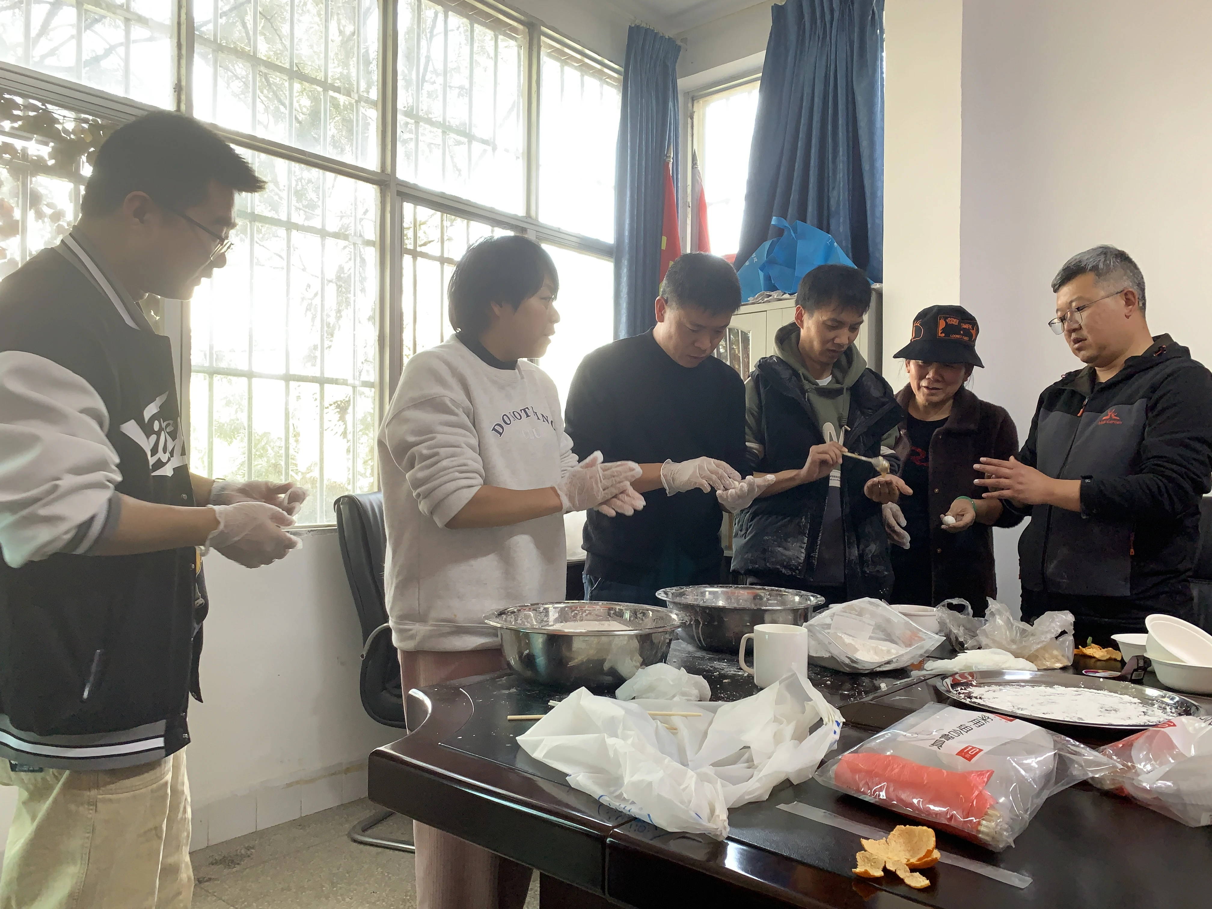 有奖竞答后,大家齐动手开始包汤圆,和面、搓圆、包馅、煮汤圆,有的现场教、有的现场学,平时忙于工作疏于交流的同事们纷纷拿出自己的看家本领,分工协作、配合默契,一碗碗诱人的汤圆摆满桌面。