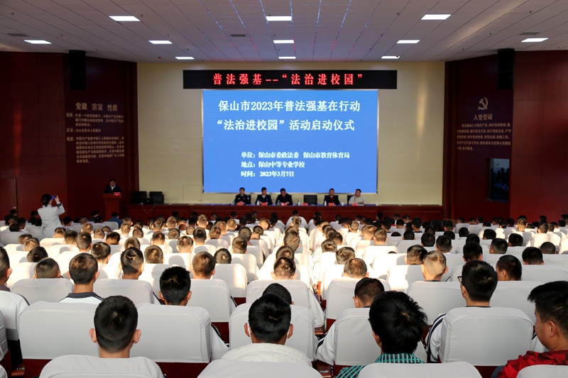 3月7日,保山市2023年普法强基在行动“法治进校园”活动启动仪式在市中等专业学校举办。省专项普法工作队第五组组长李富强宣布活动启动。市专项行动办、市教育体育局、市法学会等相关单位和学校3000余名师生现场参加。本次活动通过网络直播的方式开展,市各地、各学校师生在线收听收看。