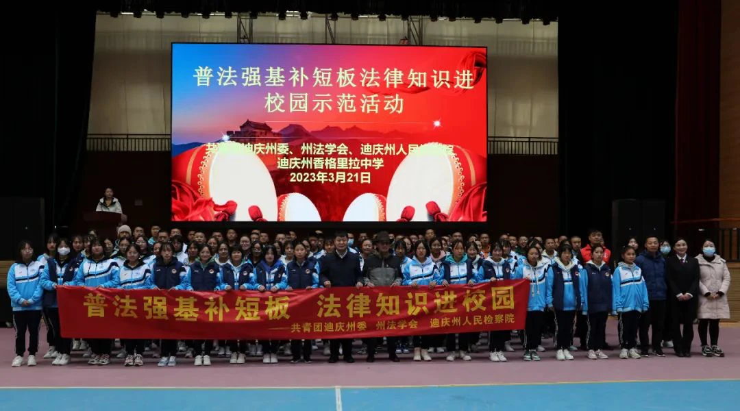 为深入推进普法强基补短板专项行动,结合《云南省检察机关“相伴青春,检护成长”未成年人法治宣传教育活动方案》,进一步营造预防未成年人违法犯罪及保护未成年人合法权益的氛围,3月21日晚,迪庆州人民检察院格桑花未检团队、州法学会、共青团迪庆州委走进香格里拉中学开展“普法强基补短板,法律知识进校园”活动,全校100余名师生参加此次活动。州法学会副会长、州普法强基补短板专项行动办公室副主任牛文欢致辞。