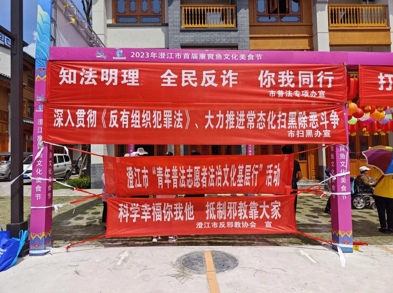 8月16日,玉溪澄江市法学会以“2023年澄江市首届䆲䆡鱼美食文化节”活动为契机,组织青年普法志愿者到凤麓古城府学商街深入开展“法治文化基层行”活动,增强全民法治观念,加强社会主义法治文化建设,强化多层次多领域依法治理,以奋发有为的精神状态扎实推动基层行活动。
