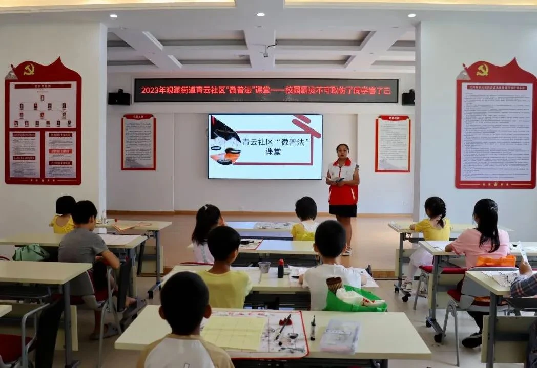 利用周一至周六青云社区“小候鸟”暑期课堂课前10分钟,开设微普法课堂,以小故事的形式向未成年人普及法律法规知识;举办书法活动,让未成年人将书法与法治相融合,将法治精神内化于心、外化于行。