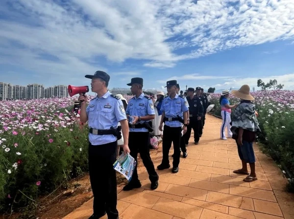 在红河州蒙自滇南绿洲生态公园格桑花盛开之际,为了确保市民能够在安全、舒适的环境中享受公园的美景,蒙自市法学会会员单位蒙自市公安局文萃、绿洲派出所普法宣传员以花为媒,在强化巡逻管控、用情服务的基础上广泛开展普法宣传,用责任和担当守护广大游客朋友的“诗和远方”。