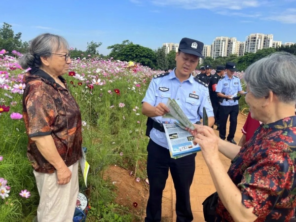 “不明链接不点击,陌生来电不轻信!”在巡逻防范的同时,普法宣传员积极开展反诈防骗宣传,通过发放宣传资料、小喇叭宣传防骗知识揭露诈骗套路等方式叮嘱前来赏花的游客谨防电信网络诈骗。同时,普法宣传员还向游客推广安装“国家反诈中心”App,筑牢反诈防骗“防火墙”,切实守护群众“钱袋子”。