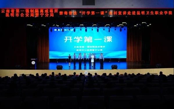 “‘毒品尝一口,死神在招手’‘一旦上瘾戒断难,一步走错坠深渊’……警察叔叔讲的顺口溜还挺押韵的,我回去说给家人听。”一名刚刚听完“开学第一课”的大一新生兴致勃勃地说道。9月18日,昆明市晋宁公安分局、区法学会联合省第一强戒所禁毒普法宣讲团以秋季开学为契机,到昆明卫生职业学院晋宁校区组织开展禁毒宣传暨“开学第一课”,切实筑牢校园毒品预防教育“防火墙”,为青少年健康成长保驾护航。