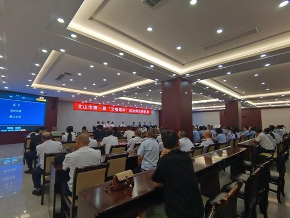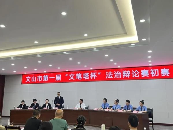 文山市法学会第一届“文笔塔杯”法治辩论赛由市人民法院、市人民检察院、市公安局、市司法局和12家市级行政执法部门与律师事务所联队共16支队伍参加。分为初赛、复赛以及决赛,比赛设置陈词立论、攻辩、攻辩小结、自由辩论、总结陈词5个阶段。