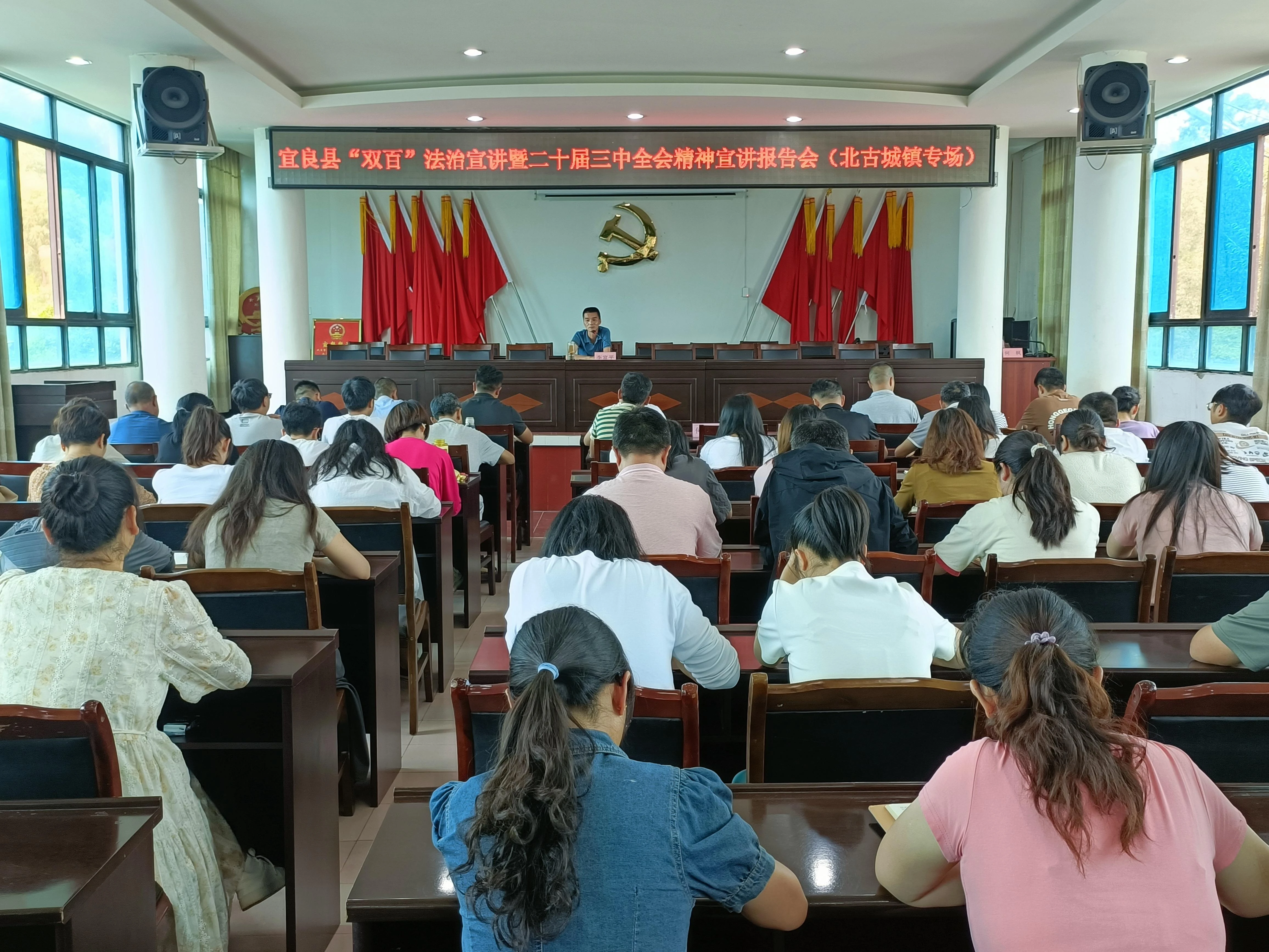 为深入学习贯彻党的二十届三中全会精神,把思想和行动统一到党中央决策部署上来,切实把全会精神落实到基层工作中,9月27日,昆明市宜良县委常委、政法委书记、县法学会会长到北古城镇开展“双百”法治宣讲暨党的二十届三中全会精神宣讲报告会,100余名乡镇干部职工参加学习。