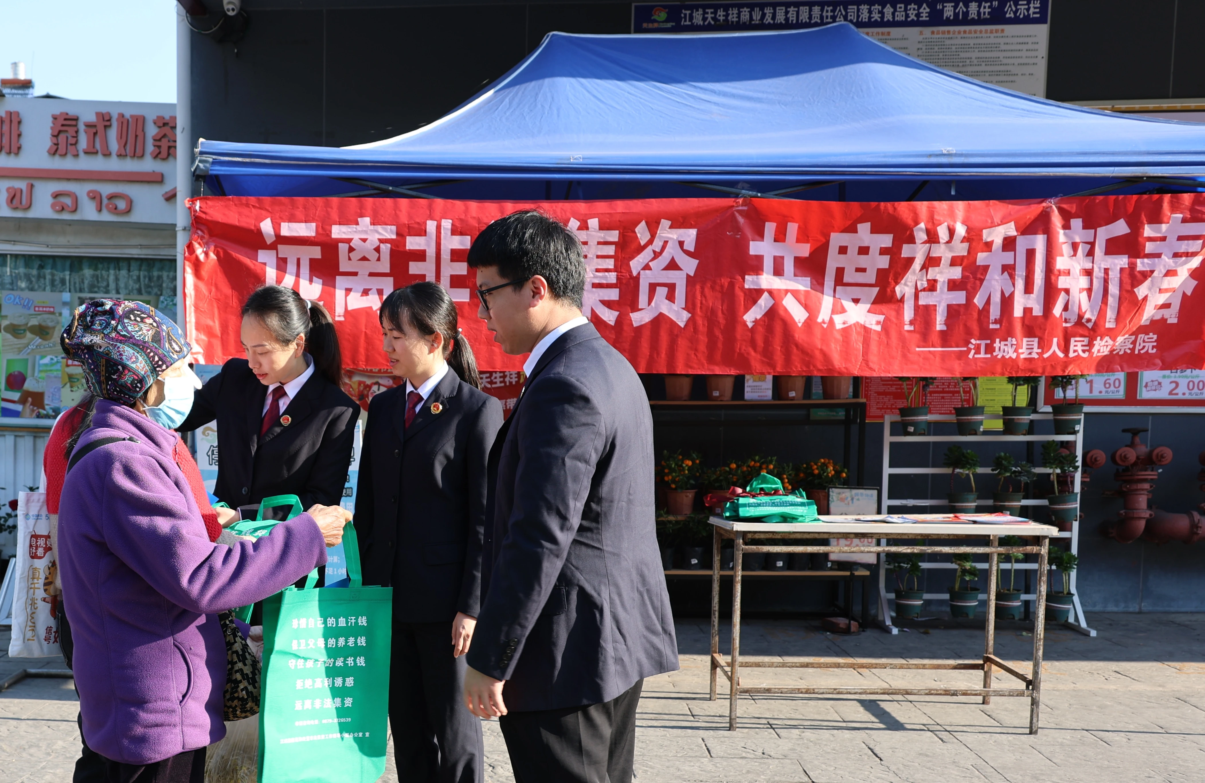 岁末年关是资金往来高峰期,也是非法集资、电信网络诈骗等违法犯罪的高发时段。为防范化解金融风险,全力守护群众财产安全,在新春来临之际,普洱市江城县法学会会员单位江城县人民检察院组织干警到超市、人流集中路段开展防范非法集资、电信网络诈骗专题普法宣传活动,以能动履职筑牢群众财产安全防线。