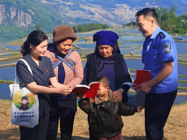 在哈尼村寨,干警采用“哈尼语+汉语”“双语”宣讲,结合非法采伐、用水纠纷等案例,讲解耕地、水源及相邻权保护规定,并耐心解答大家提出的法律问题,村民纷纷表示要依法护田、和睦相处。