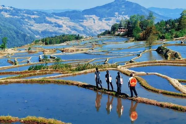 春日梯田如画,法院干警沿田埂开展普法工作,用通俗语言解读民法典中有关文化遗产保护、旅游生态责任、水源保护的条款,并结合乱扔垃圾、污染水源等不文明行为以案释法。