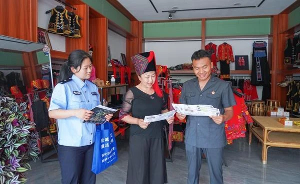 活动中,法院干警结合群众日常生活中常见的商标侵权、盗版书籍、假冒商品、图片盗用等典型案例,用通俗直白的语言,向过往群众深入浅出地解读商标法、著作权法、专利法等法律法规,详细讲解知识产权的定义、类型、侵权认定及维权路径,同时提醒大家,购买商品需认准正规商标,自觉抵制盗版影音书籍,不擅自使用他人原创作品,引导群众牢固树立“尊重知识、崇尚创新、诚信守法”的理念。同时,针对绿春本地众多的茶叶、红米、香辛料等农特产品经营者,干警还围绕“如何保护自己的特色品牌”“如何合法使用地理标志”等问题,提供了极具针对性的风险防控建议,助力地域特色农产品品牌发展,为乡村振兴注入法治动能。